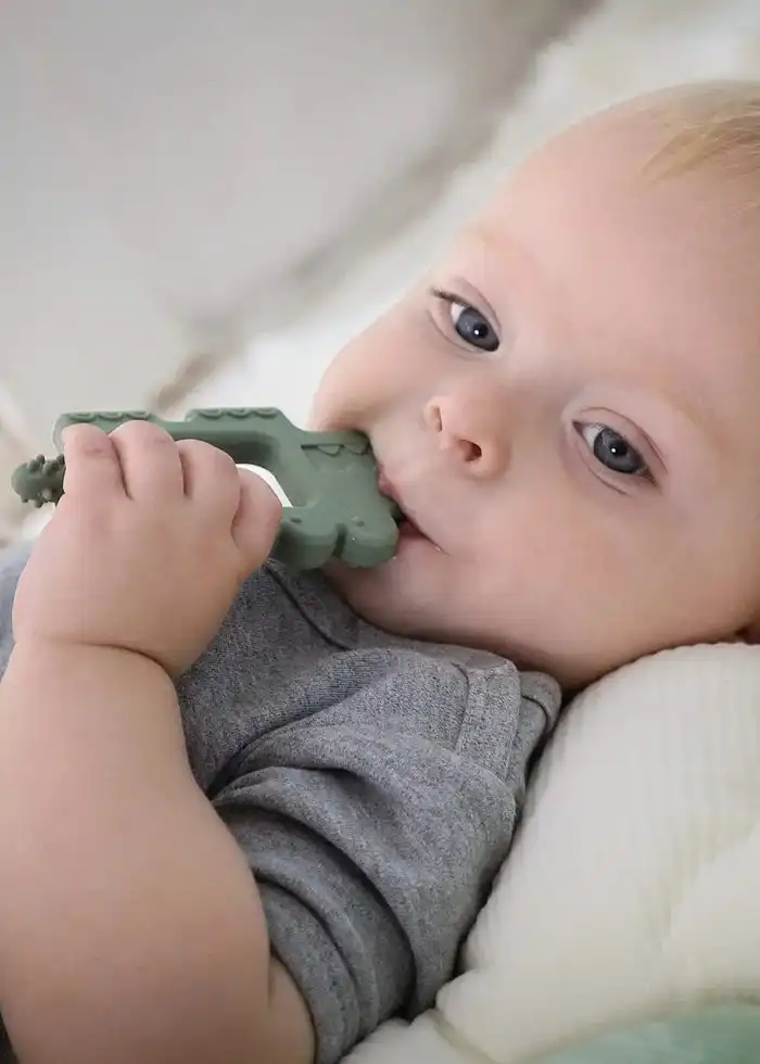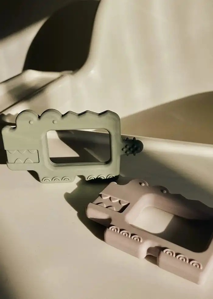 Giv dit barn tryg lindring under de første tandfrembrud med denne beige/grønne krokodille-bidering. Den bløde, men holdbare silikone giver øjeblikkelig komfort til ømt tandkød og skaber rolige og hyggelige stunder for både baby og forælder. Bideringen er designet med en dobbelt funktion: den lindrer ubehag ved tandfrembrud og beroliger samtidig den lille, nysgerrige baby. De sjove former og farver stimulerer sanserne, fremmer leg og udforskning og hjælper med at udvikle både motoriske og kognitive færdigheder. Et trygt, praktisk og sjovt redskab til små hænder, der lærer verden at kende, mens de får lindring og komfort i en vigtig fase af livet.