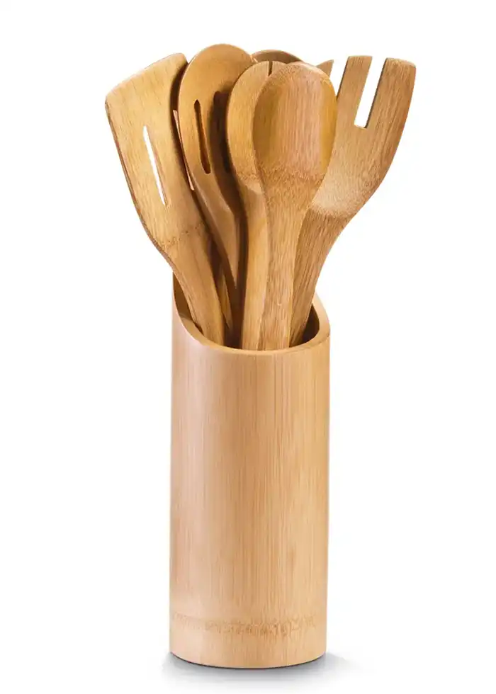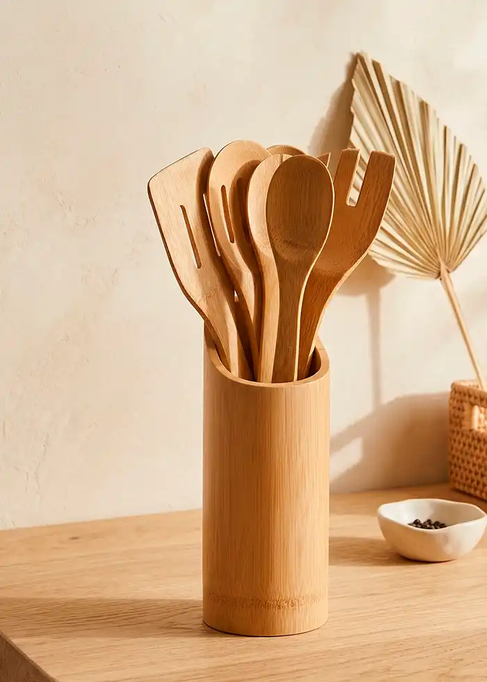 Denne smukke køkkenredskabsholder i bambus samler alle dine nødvendige redskaber ét sted, så de altid er lige ved hånden. Sættet indeholder 1 par tænger, 2 spartler og 3 grydeskeer – alt lavet i fint, naturligt bambustræ. Den klassiske holder passer ind i ethvert køkken og skaber en rolig, hjemlig stemning, mens bambusets naturlige struktur giver varme og charme til bordet eller køkkenbordet. En praktisk og smuk detalje, der gør madlavningen mere overskuelig og hyggelig for hele familien.