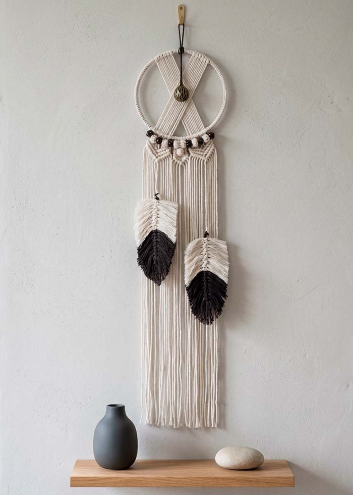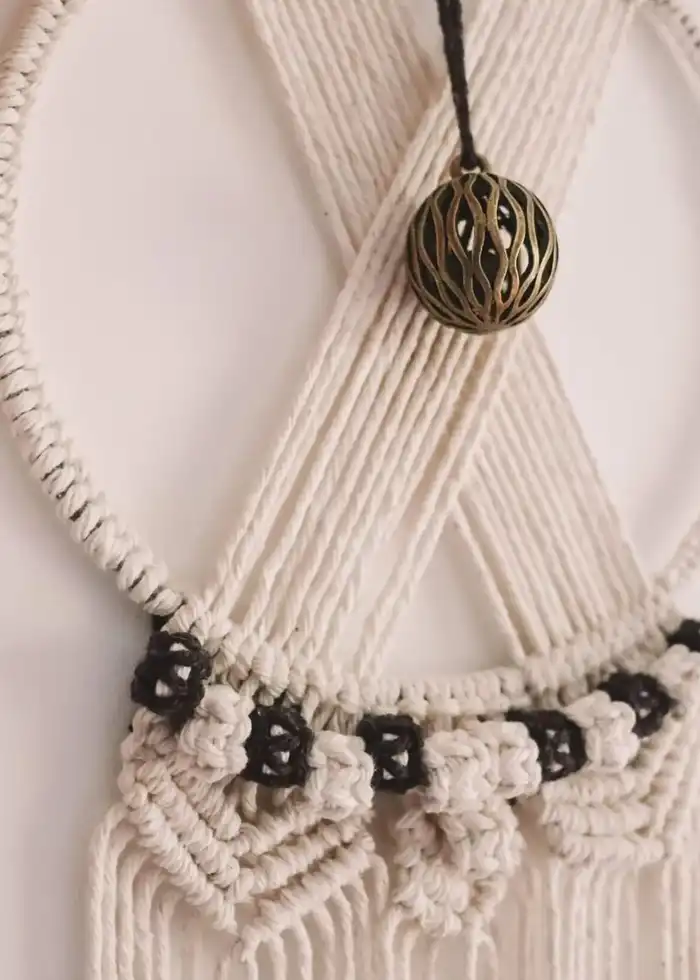 Denne smukke macramé fungerer som en “caller of angels” med en lille ring, der siges at tilkalde englenes nærvær. Ifølge gamle traditioner bringer det ro og beskyttelse, når den rystes, og minder os om, at vi aldrig står alene. Et elegant og poetisk element til hjemmet, der kombinerer symbolik og skønhed. Den fungerer både som dekorativ detalje og som en stille påmindelse om nærvær, balance og beskyttelse.