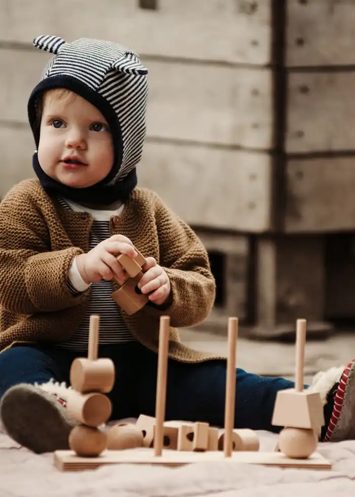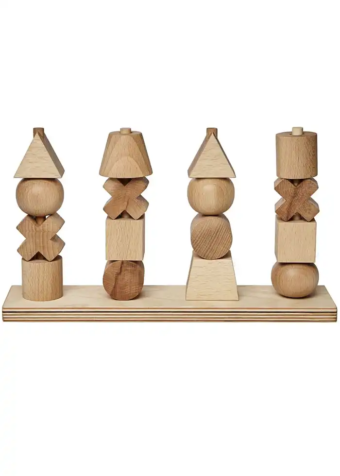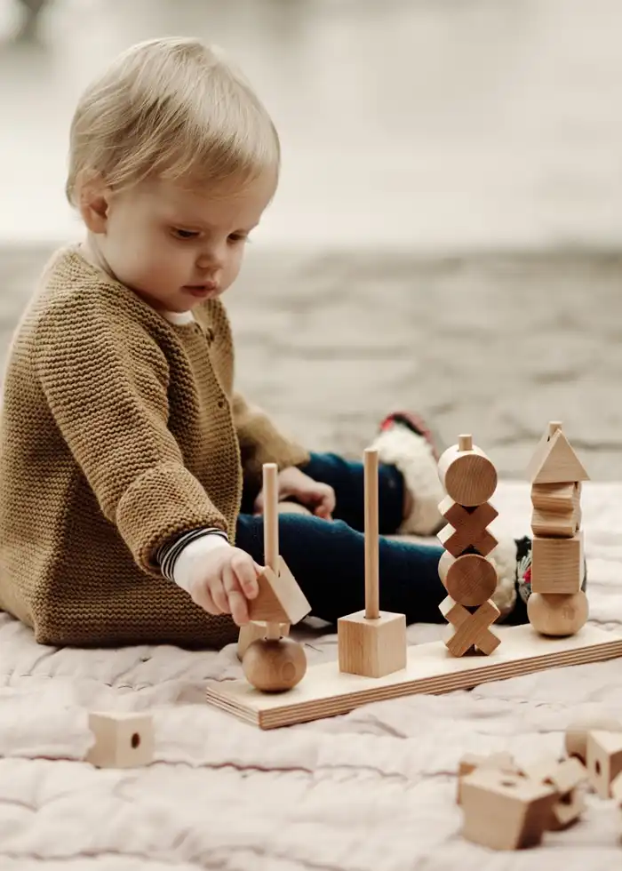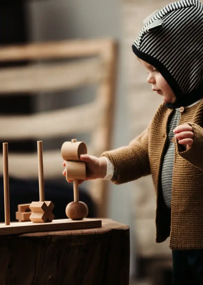 Montessori stablelegetøj i XL-format inviterer barnet til leg fyldt med ro, nærvær og opdagelse. Undervejs styrkes motorik, hånd-øje-koordination og evnen til at eksperimentere, mens barnet på en legende måde opdager balancen mellem form og bevægelse.