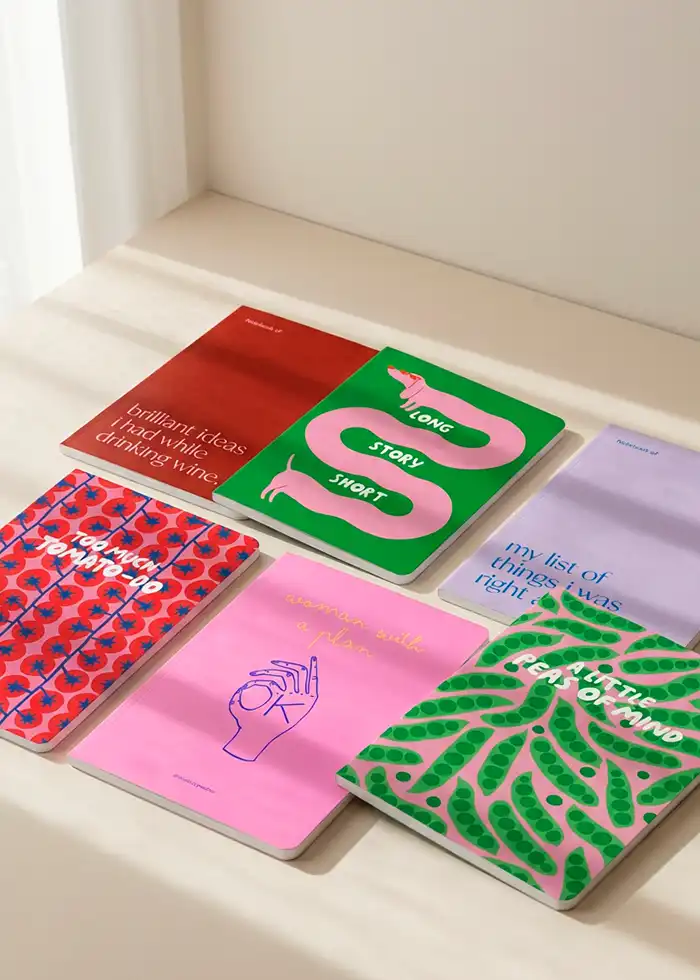 De seks designs – Brilliant Ideas i had while drinking wine, my list of things i was Right About, Woman With a Plan, Long Story Short, a little Peas of Mind, too much Tomato-do – giver dig mulighed for at vælge en notesbog, der passer til dit humør, dit formål eller bare som et lille statement på skrivebordet.