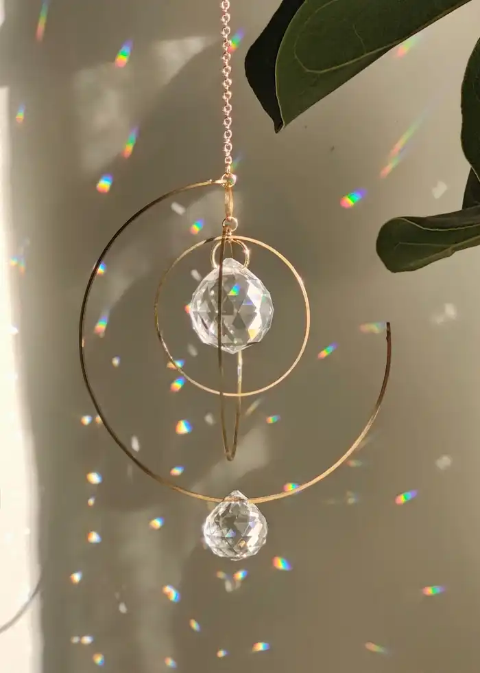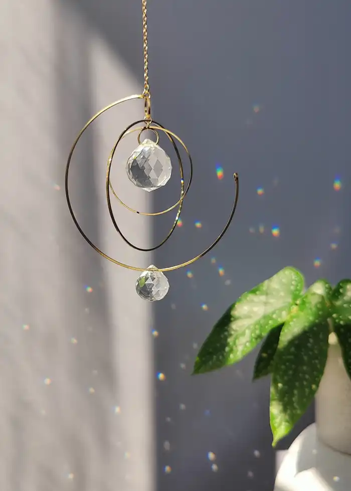 Inspireret af himmellegemernes rolige baner forener denne solfanger enkle messinglinjer med to facetslebne krystaller, der fanger sollyset og sender blide regnbueglimt ud i rummet. Når den hænger foran et vindue, ved en plante eller i et roligt hjørne, opstår der små farvede strejf på vægge og gulv – som stille påmindelser om at sætte tempoet ned.