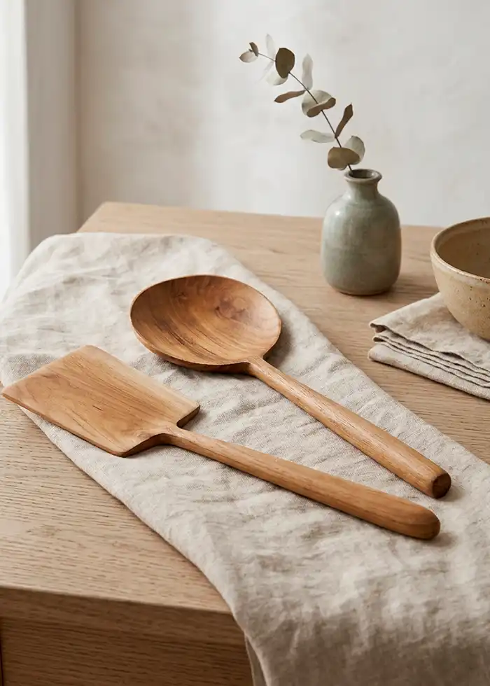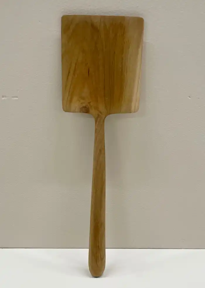 Et sæt med to smukke, håndlavede spatler i massivt teaktræ, der kombinerer funktion og æstetik i køkkenet. Den runde og den firkantede form giver dig mulighed for både at røre, servere og præsentere mad med stil – eller blot lade spatlerne pynte på køkkenbordet som dekorative elementer. Teaktræets varme farvetoner og naturlige åretegninger gør hver spatel unik, og den glatte, håndpolerede overflade føles behagelig i hånden under madlavning. De er holdbare, tidløse og passer perfekt ind i både moderne og klassiske køkkener. Et funktionelt køkkenværktøj, der også kan bruges som en lille, varm og naturlig dekorationsdetalje.