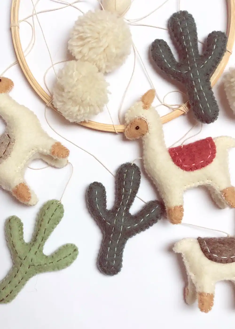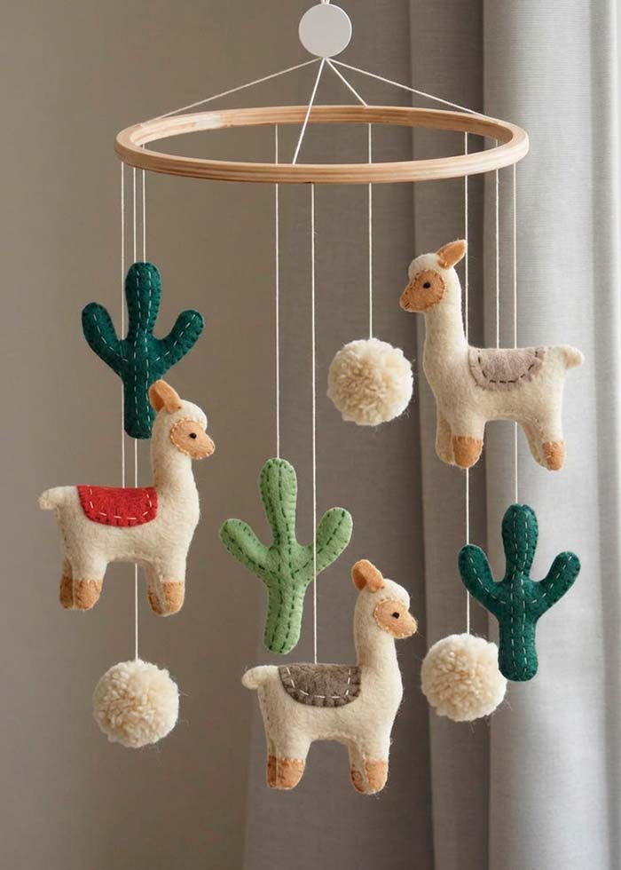 Forkæl det nyfødte barn med denne charmerende uro med lamaer og kaktusser, designet til at bringe varme og hygge ind i ethvert børneværelse. Hver figur er omhyggeligt håndlavet af uld af højeste kvalitet fra New Zealand og fyldt med blødt, genanvendt polyester, hvilket giver en let og blød uro, der bevæger sig yndefuldt over barnets seng eller puslebord. En perfekt gave til babyshower, fødselsdag eller som barselsgave. Hver uro er unik, og små variationer i form og farve gør produktet helt særligt. Den rolige og legende kombination af lamaer og kaktusser skaber et hyggeligt og inspirerende miljø, hvor barnet kan nyde trygge og stimulerende øjeblikke. En dekorativ detalje, der både pynter i rummet og skaber en blid, visuel oplevelse for de små.