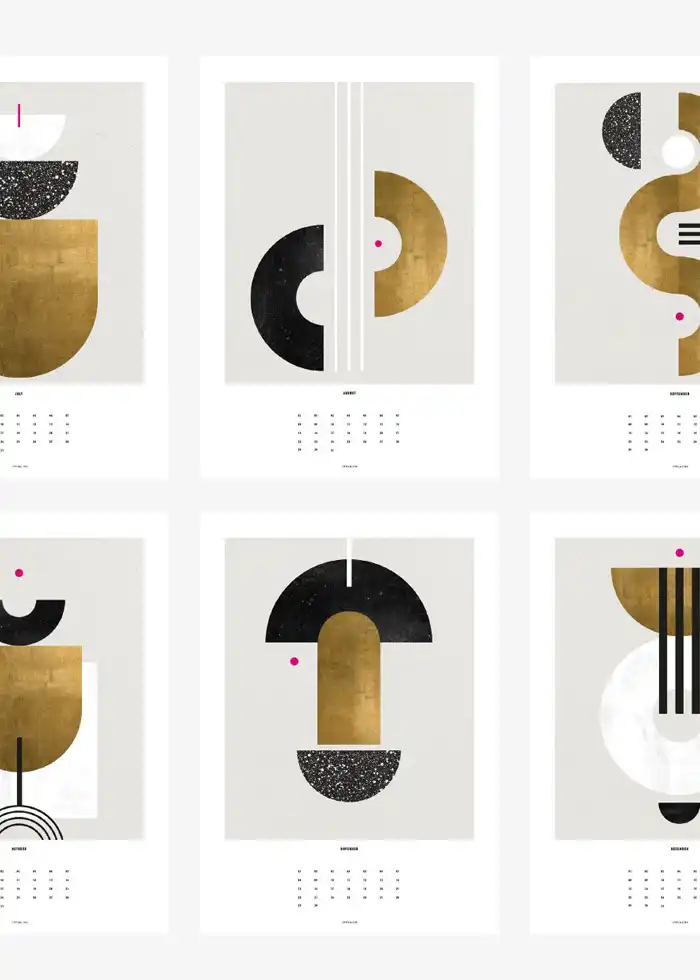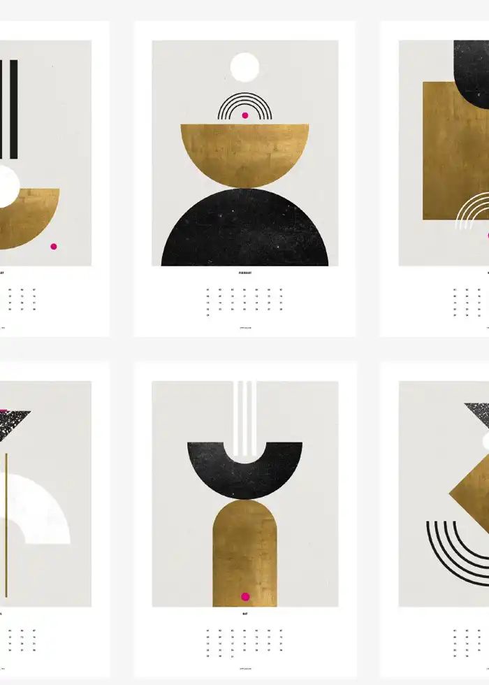 Vi har med vilje undladt ugedagene, så kalenderen kan hænge året rundt uden at miste sit dekorative udtryk. Hver måned præsenterer et unikt geometrisk mønster – fra bløde cirkler, elegante linjer og dynamiske sammensætninger. Mønstrene leger med form, proportion og kontrast, og de inviterer øjet til at udforske, hvile og blive inspireret. Farverne er rolige, harmoniske og skaber et minimalistisk, poetisk udtryk, der giver både energi og ro.