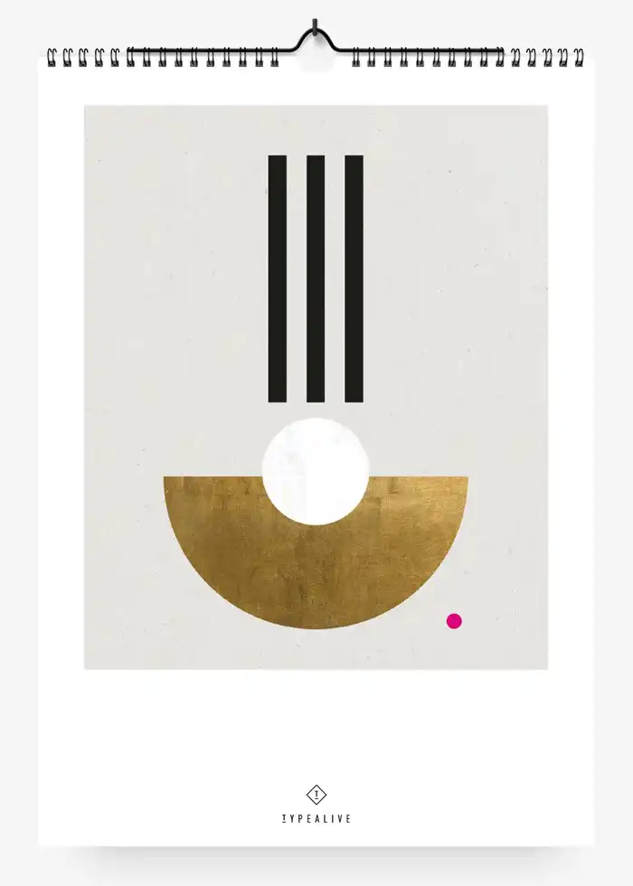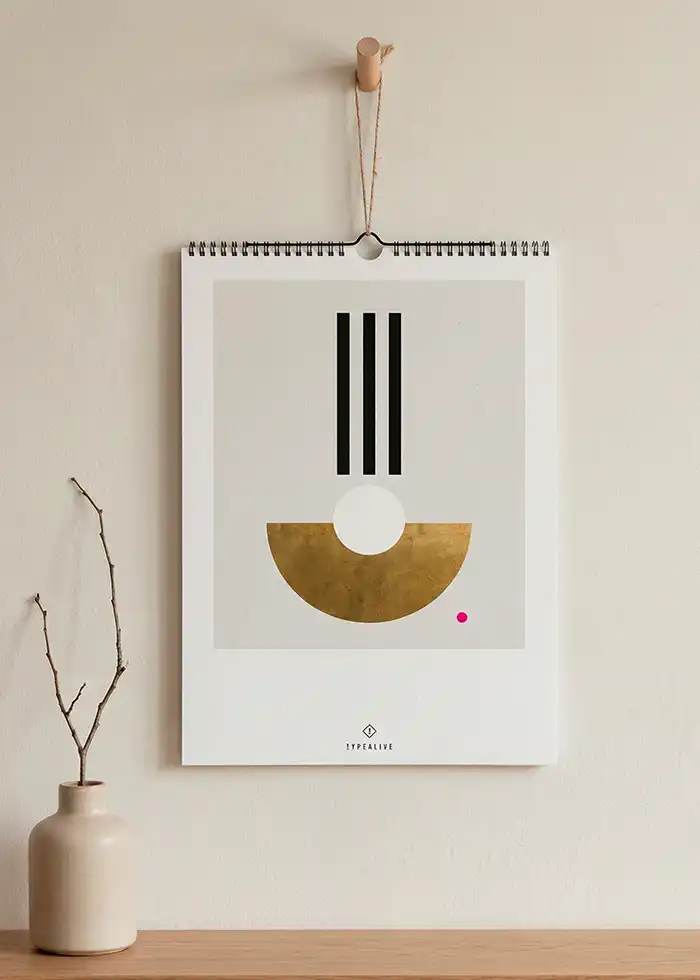 Kalenderen er i praktisk DIN A3-format med 13 sider: forside + 12 måneder. Trykt i firefarvet offsettryk på premium mat papir (135 g/m²), som fremhæver farver og figurer med smuk dybde og klarhed. Spiralryggen med ophængskrog gør det nemt at hænge op og bladre måned for måned, mens hver geometrisk komposition kan beundres i fuld størrelse.
