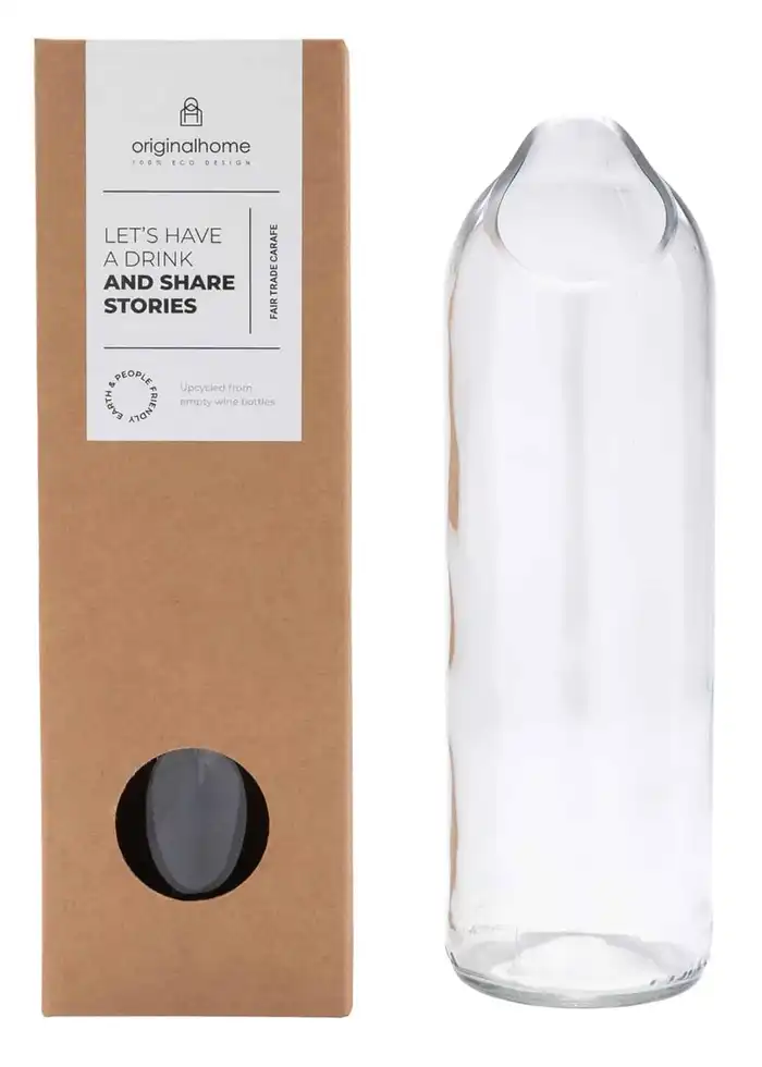 Giv hverdagen et strejf af bæredygtig elegance med denne smukke vandkaraffel. Hver karaffel er fremstillet af genbrugte vinflasker, som har fået nyt liv i en enkel og stilfuld form. Det giver ikke blot et unikt og levende glasudtryk – det gør også valget mere ansvarligt. Den klare form og det genanvendte glas tilfører borddækningen et naturligt og afslappet udtryk, hvor bæredygtighed og æstetik går hånd i hånd. Et smukt valg til dig, der ønsker funktionalitet med omtanke – og som sætter pris på produkter med historie og sjæl. Leveres i en gaveæske.